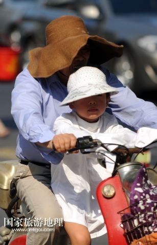 8月8日,杭州城區(qū)一位帶著孩子的騎車人在烈日下前行。