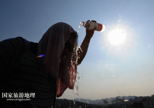 8月8日,杭州西湖景區(qū)附近一位游人經(jīng)受不住高溫,往頭上澆水降溫。