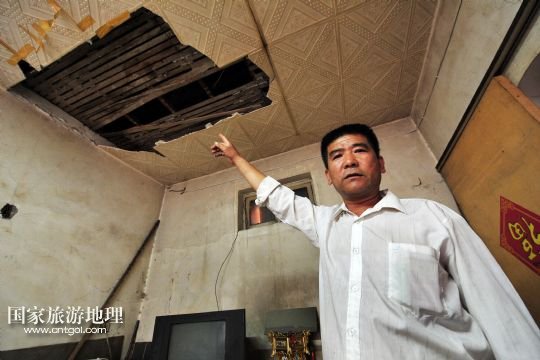 在寧夏回族自治區(qū)石嘴山市大武口區(qū)人民街道工人街社區(qū)的原洗煤廠老舊小區(qū)內(nèi),53歲的張鳳友向記者展示自家殘破的天花板。他現(xiàn)在和妻子已經(jīng)搬到外面租房住了,這里平時(shí)就租給附近工地上的工人(9月3日攝)。