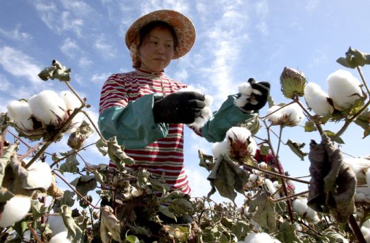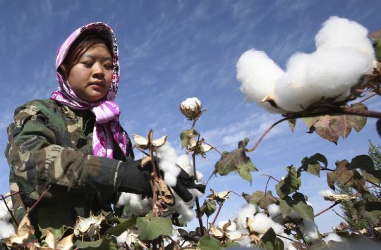 9月24日,一名河南籍拾花工在新疆哈密現(xiàn)代農(nóng)業(yè)園區(qū)棉區(qū)采摘棉花。