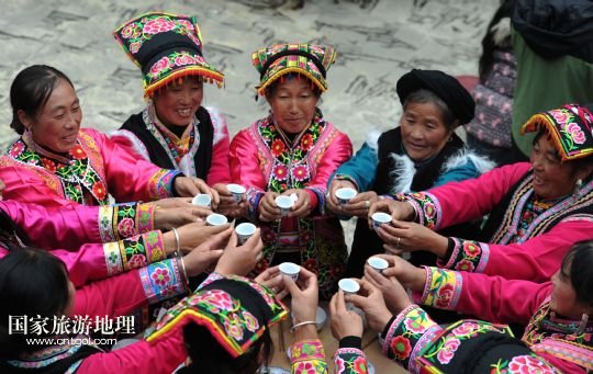 國家旅游地理 四川阿壩11月2日訊 11月2日,身著節(jié)日盛裝的四川省阿壩州汶川縣龍溪鄉(xiāng)村民們舉杯迎接羌?xì)v新年的到來。當(dāng)日,四川省阿壩州汶川縣龍溪鄉(xiāng)舉行傳統(tǒng)儀式迎接即將到來的羌?xì)v新年。今年的11月3日農(nóng)歷十月初一是羌?xì)v新年,這是羌族一年中最為隆重的“慶豐收、送祝福、祈平安”的節(jié)日,按民間習(xí)俗,過羌年時要還愿敬神,全寨人歡聚一堂,吃團圓飯,共慶佳節(jié)。 /新華社發(fā)(何海洋 攝)