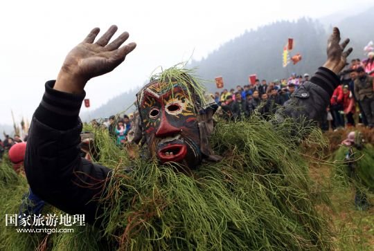 國(guó)家旅游地理 廣西柳州2月20日訊 2月16日,一名苗族青年戴著面具、披著芒草,扮成 “芒哥”跳舞。當(dāng)日是農(nóng)歷正月十七,地處深山的廣西柳州市融水苗族自治縣安陲鄉(xiāng)在江門(mén)苗寨舉行傳統(tǒng)的“芒哥節(jié)”。眾多苗族男性青少年戴著面具、披著芒草、扮成“芒哥”起舞,為人們驅(qū)邪避禍,送去新春的祝福。據(jù)介紹,演“芒哥”是當(dāng)?shù)孛缂胰霜?dú)具特色的新春傳統(tǒng)活動(dòng)之一。 /新華社發(fā)(龍濤 攝)