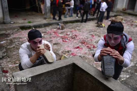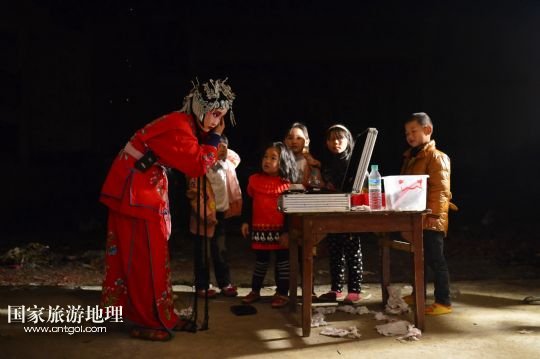國家旅游地理 江西九江4月2日訊 在溪口鎮(zhèn)小溪村,三元班在演出寧河戲《三請樊梨花》(3月26日攝)。寧河戲是江西地方大型古老劇種之一,發(fā)源于江西修水縣,流行于贛北及湘、鄂、贛交界一帶。在寧河戲鼎盛的清乾隆年間,曾出現(xiàn)過“寧州十八班”,從業(yè)人員達(dá)到六七百人。然而隨著時代的變遷,寧河戲逐步?jīng)]落,最大的危機(jī)是逐漸空心化的村莊和村莊里越來越少的老戲迷。